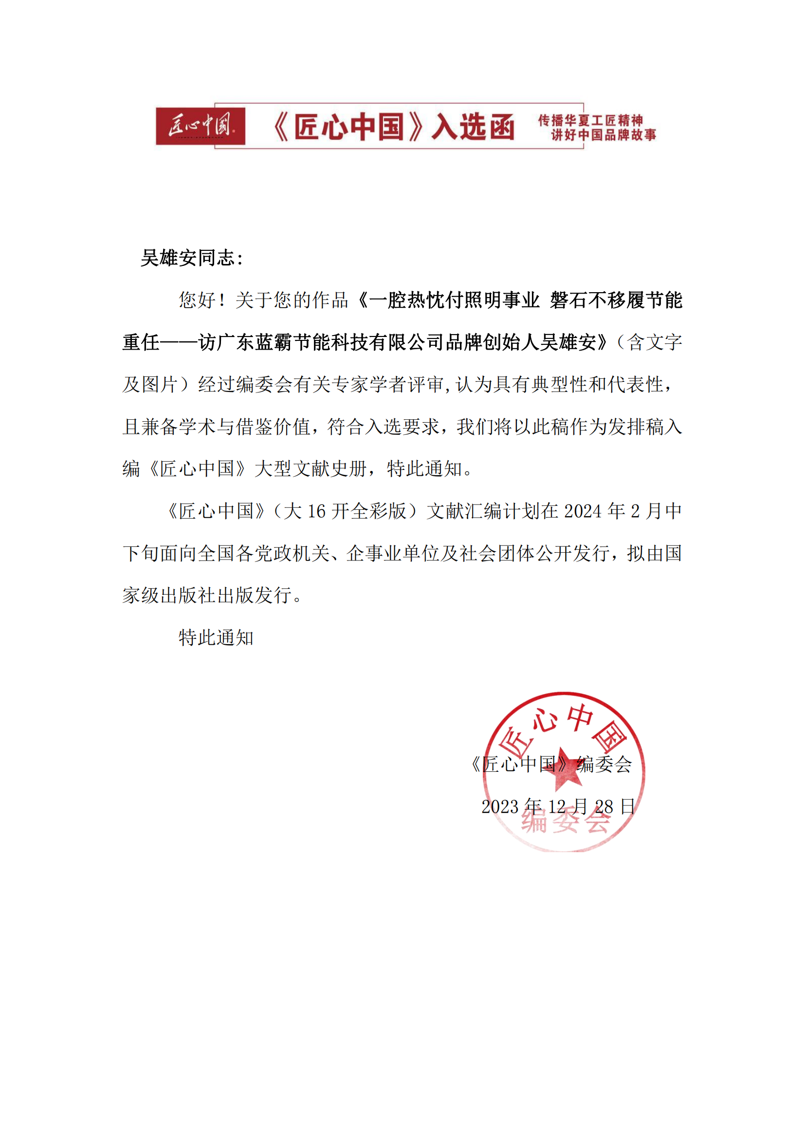 《一(yī)腔熱(rè)忱付照(zhào)明(míng)事(shì)業(y→↕σ™è) 磐石不(bù)移履節能(néng)重任——訪佛↔®≠山市順德路特威節能科技有限公司品牌創始人(rén)吳雄安》經過編↔☆ ↕委會(huì)有(yǒu)關專家(jiā)學者評審,認為(wèi)具有(yǒ> u)典型性和(hé)代表性,且兼備學術(shù)與借鑒價值δ€,符合入選要(yào)求,将以此稿作(zuò)為(wèi)發排稿入編《匠(jiàng)心 中國(guó)》大(dà)型文(wén)獻史冊。……查看(kàn)詳情